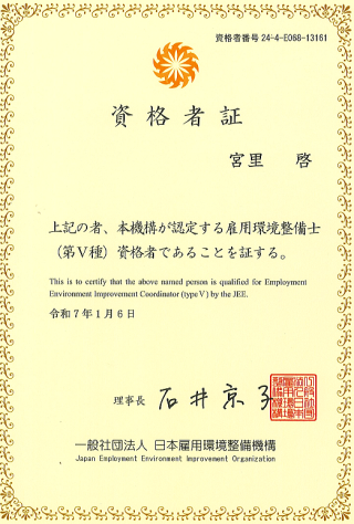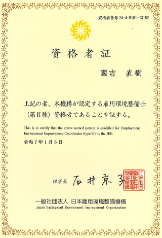 このほど社内に雇用環境を整備できる資格者(雇用環境整備士)を2名設置いたしました。
